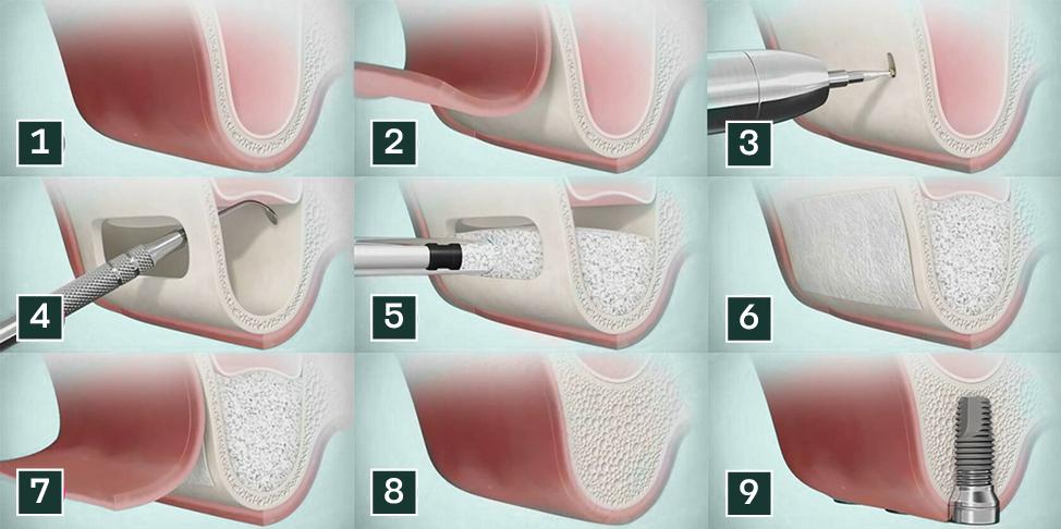 При открытом синус-лифтинге хирург аккуратно «открывает» десну, делает в кости отверстие (для это используется специальная фреза) и через него поднимает дно гайморовой пазухи, а образовавшуюся полость заполняется костным материалом. После этого кость покрывают барьерной мембраной, а десна ушивается. Иногда условия костной ткани позволяют установить имплантат одномоментно с этой манипуляцией.