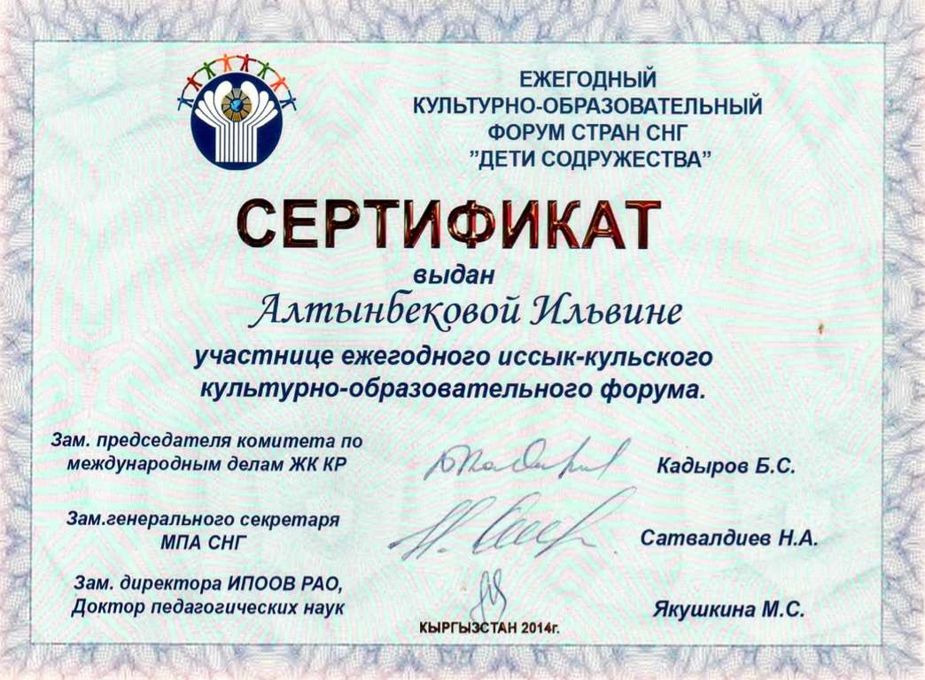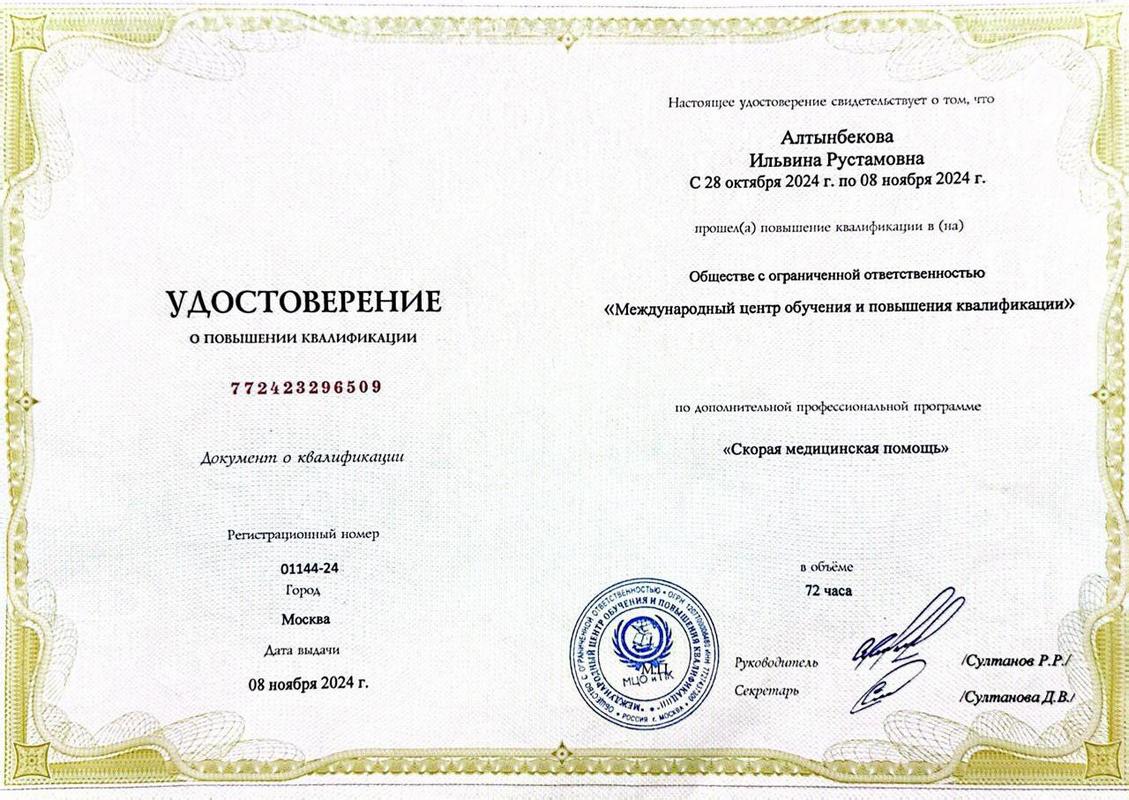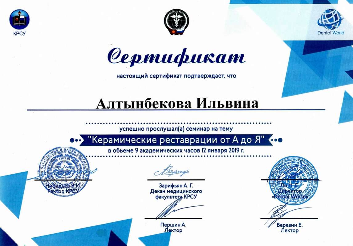 2020 г. — Базовое. Кыргызско-Российский Славянский Университет имени Б.Н Ельцина. Специальность: Врач-стоматолог;