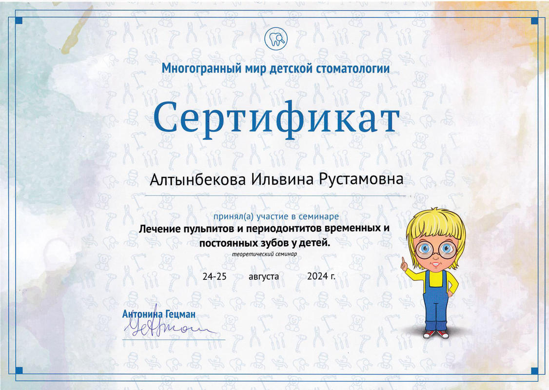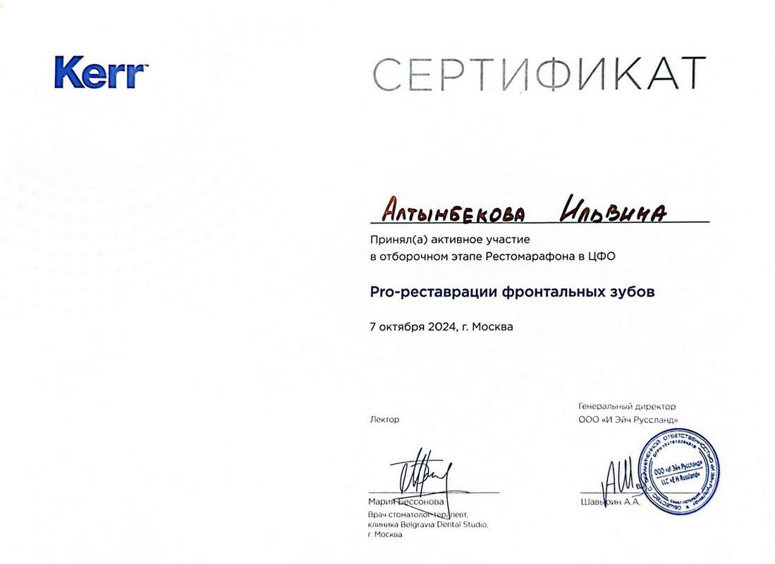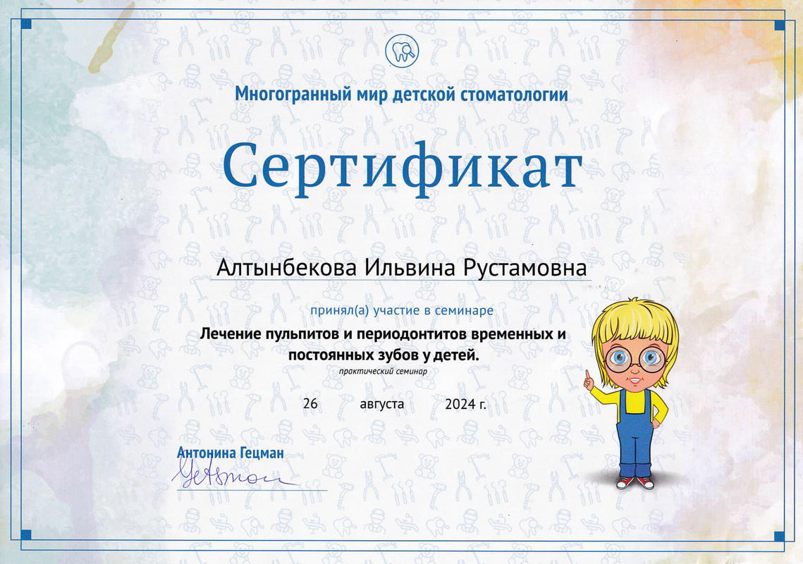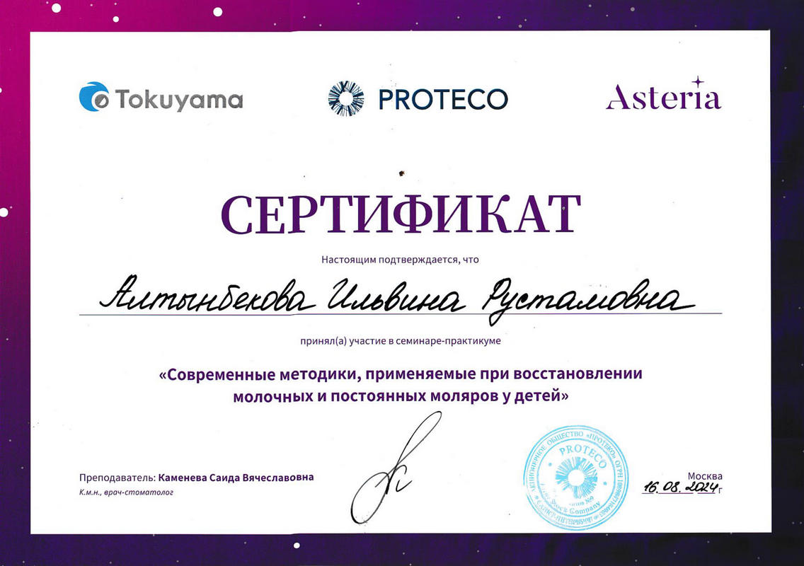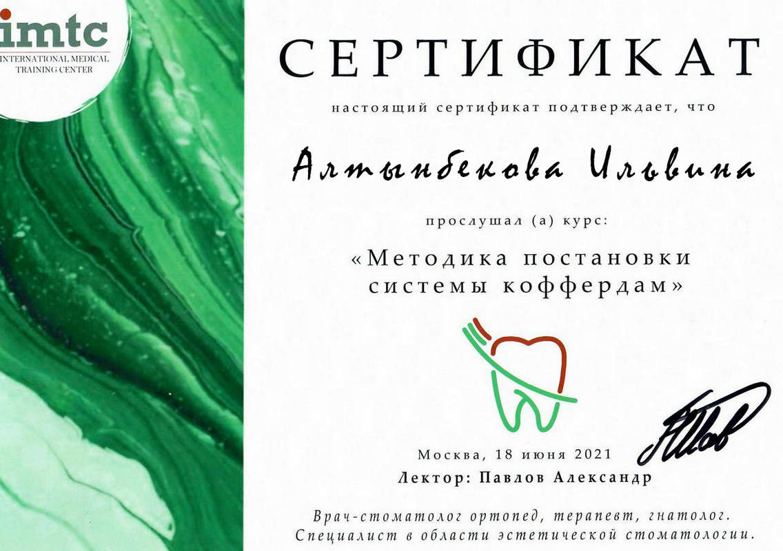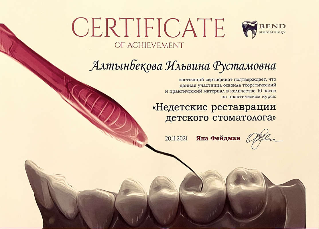 2021 г. — участие в теоретическом и практическом курсе Bend Stomatology «Недетские реставрации детского стоматолога» Яна Фейдман;