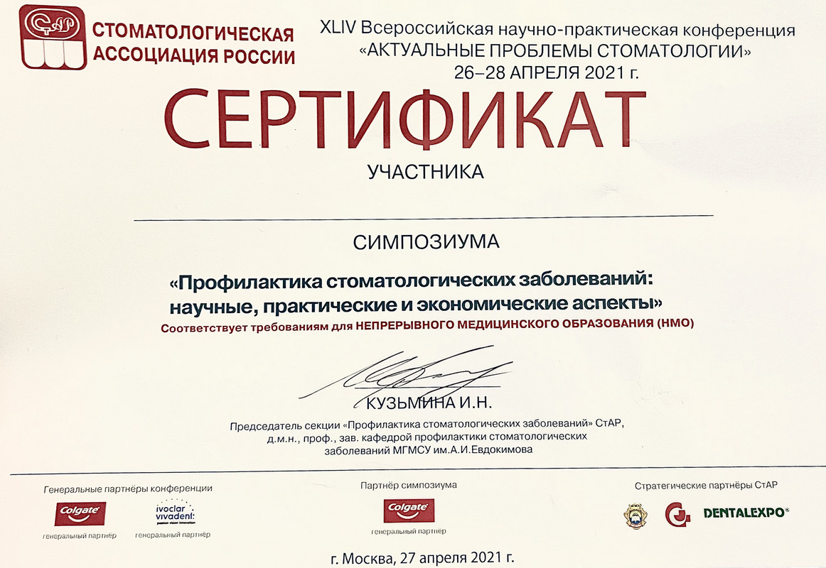 2021 г. — участие в обучающем курсе XLIV Всероссийская научно-практическая конференция «Актуальные проблемы стоматологии», Симпозиум «Профилактика стоматологических заболеваний: научные, практические и экономические аспекты» Кузьмина И.Н.;