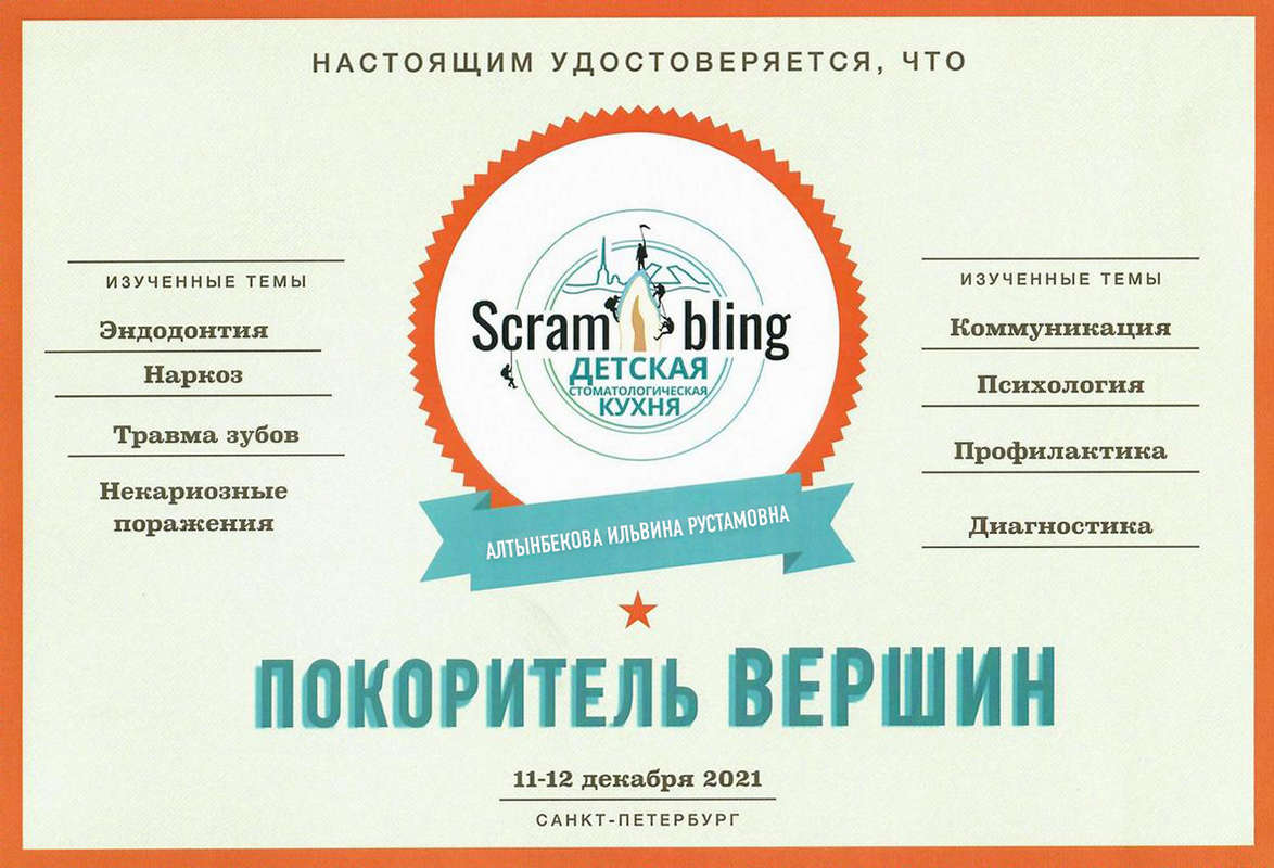 2021 г. — участие «ScramBling — Детская стоматологическая кухня» (Эндодонтия, Наркоз, Травма зубов, Некариозные поражения, Коммуникация, Психология, Профилактика, Диагностика);
