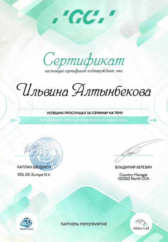 2019 г. — участие в обучающем курсе Dental World «Керамические реставрации от А до Я», Першин А., Березин Е.;