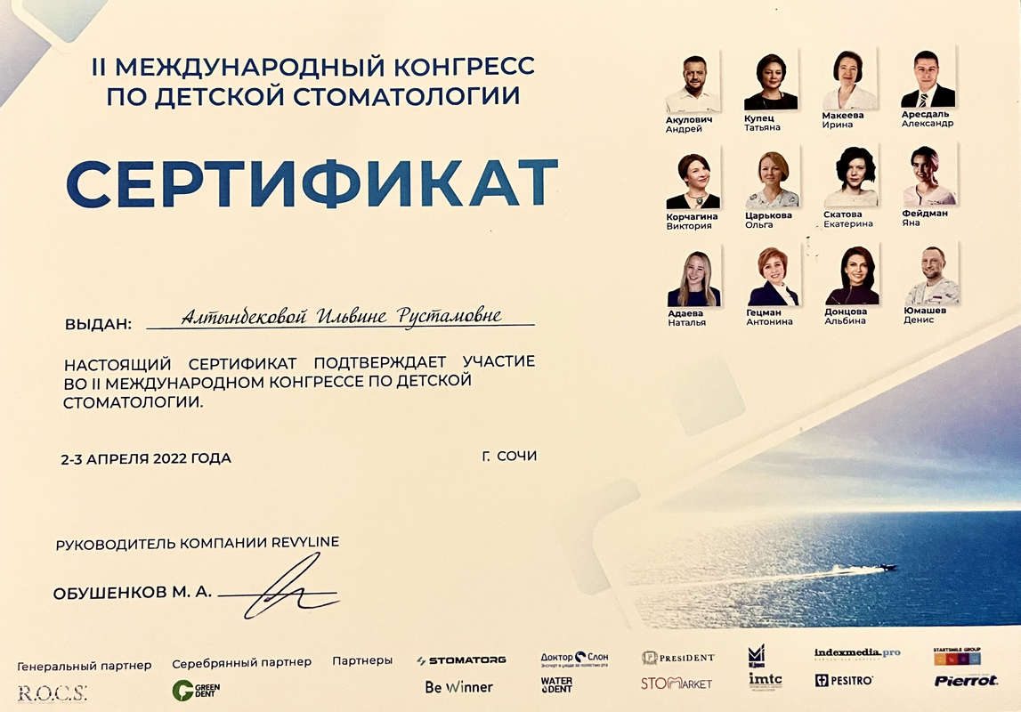 2022 г. — II Международный конгресс по детской Стоматологии «Revyline» Акулович А., Купец Т., Макеева И., Аресдаль А., Корчагина В., Царькова О., Скатова Е., Фейдман Я., Адаева Н., Гецман А., Донцова А., Юмашев Д.