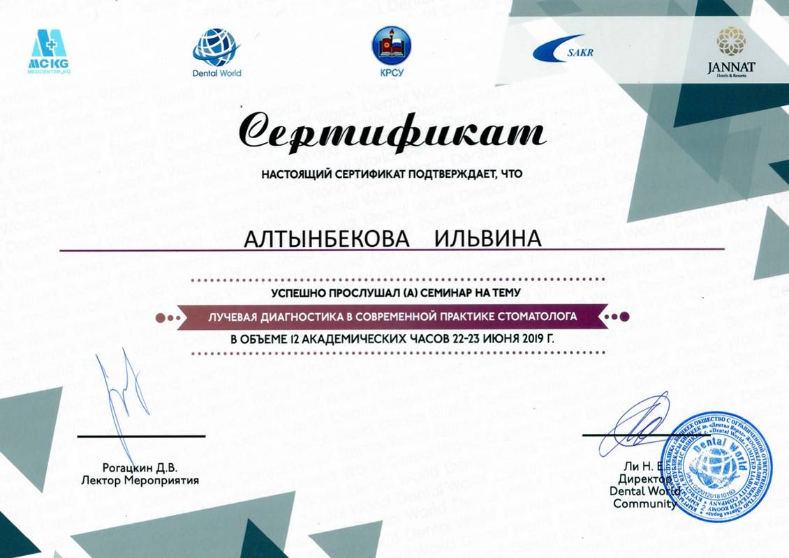 2019 г. — участие в обучающем курсе Dental World «Лучевая диагностика в современной практике стоматолога», Рогацкий Д.В.;