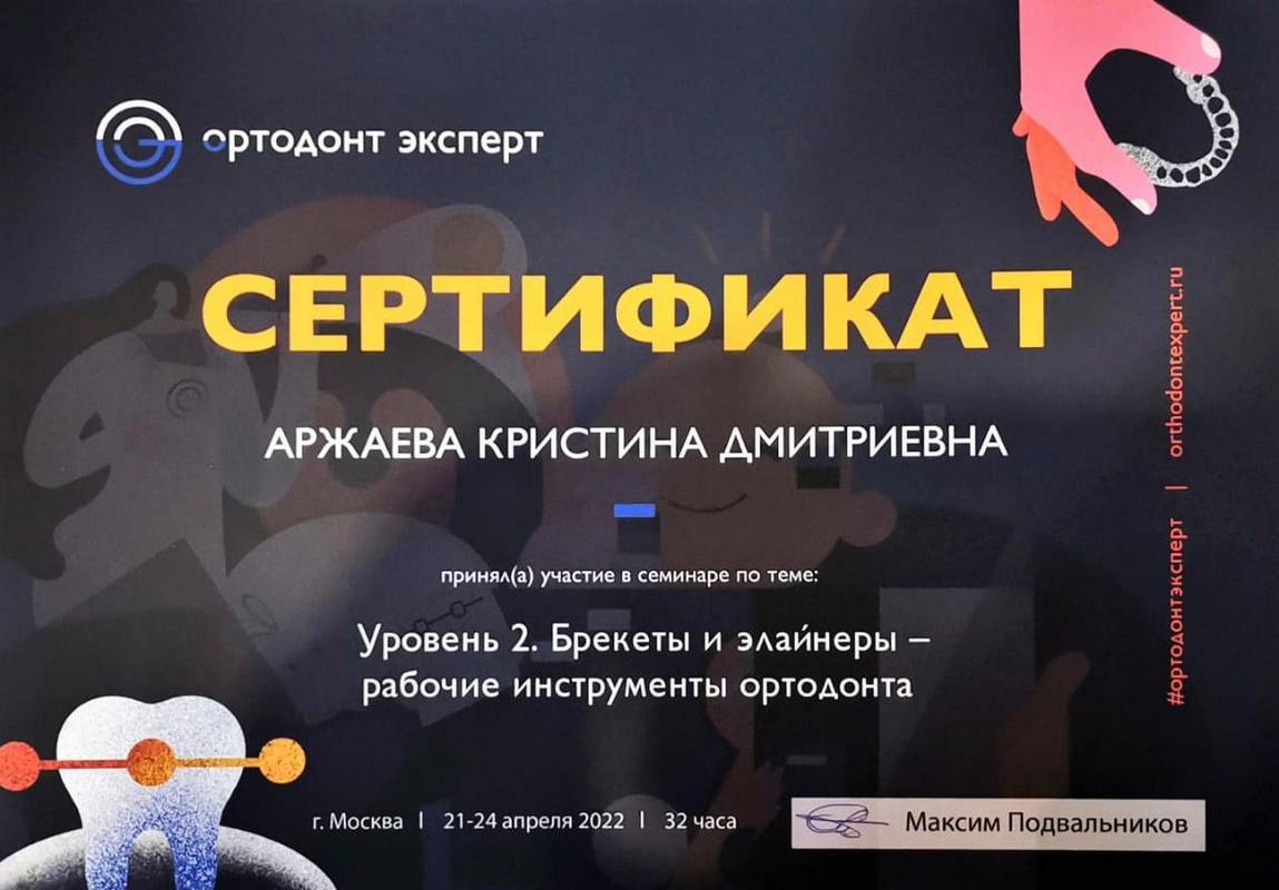 2022г. — семинар на тему: «Школа ортодонтии. Брекеты и элайнеры — рабочие инструменты ортодонта». Лектор: Подвальников Максим Сергеевич г.Москва