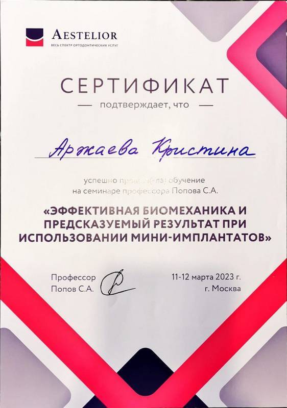 2023г. — семинар на тему: «Эффективная биомеханика и предсказуемый результат при использовании мини-имплантатов в ортодонтии». Лектор: Попов Сергей Александрович г.Москва
