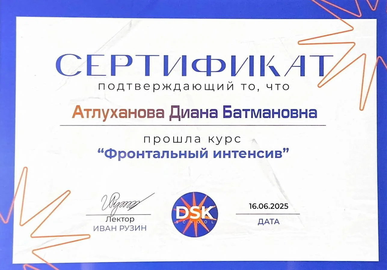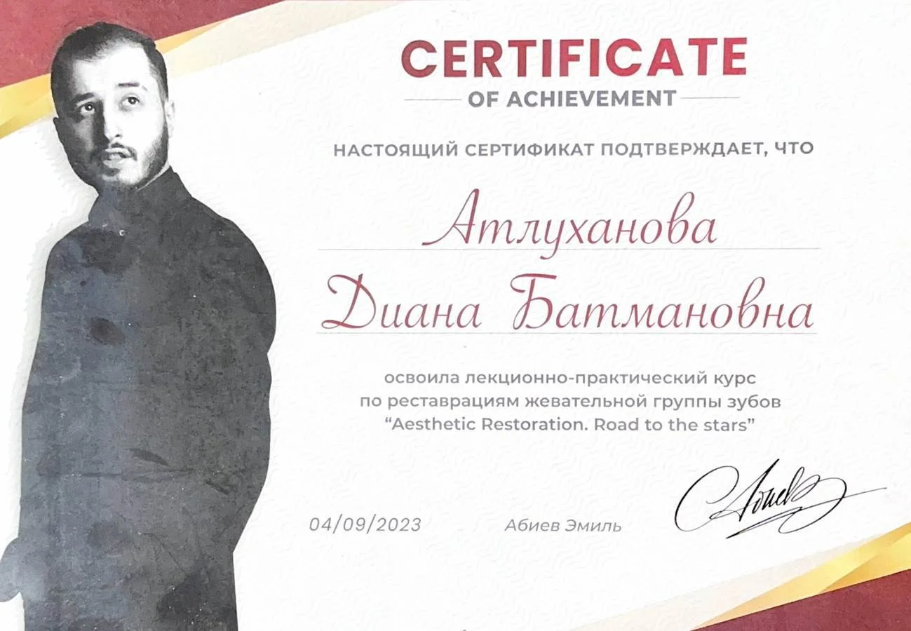 - 2025г. — Диплом «Стоматология терапевтическая»