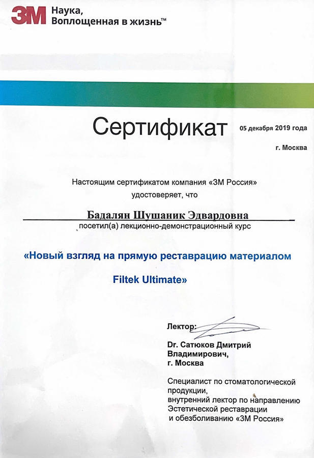• 2019г. — «Новый взгляд на прямую реставрацию материалом Filtek Ultimate», 3М