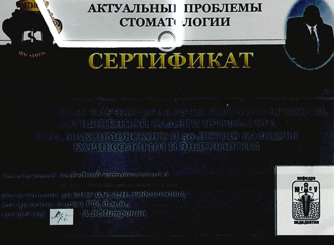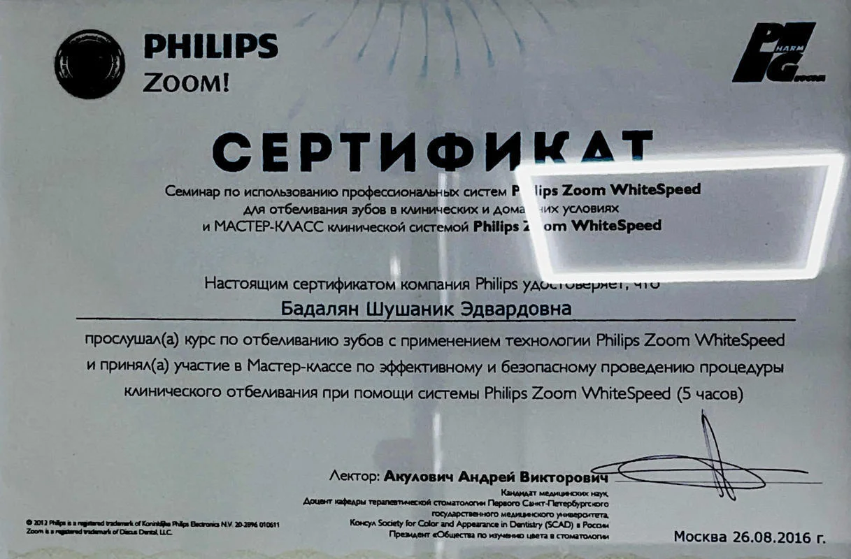 • 2016г. — «Семинар по использованию профессиональных систем Philips Zoom Whitespeed для отбеливания зубов в клинических и домашних условиях и мастер класс клинической системой Philips Zoom Whitespeed», Moscow.
