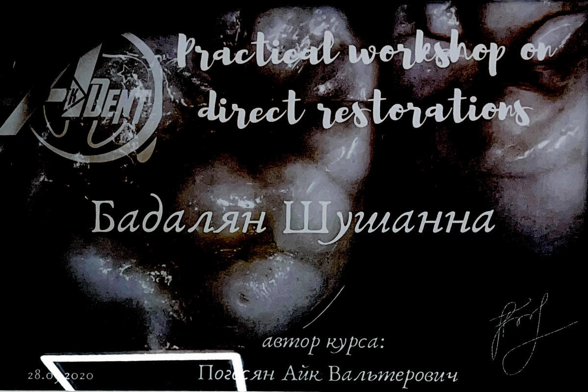 • 2020г. — «Practical workshop on direct restorations», Moscow.
