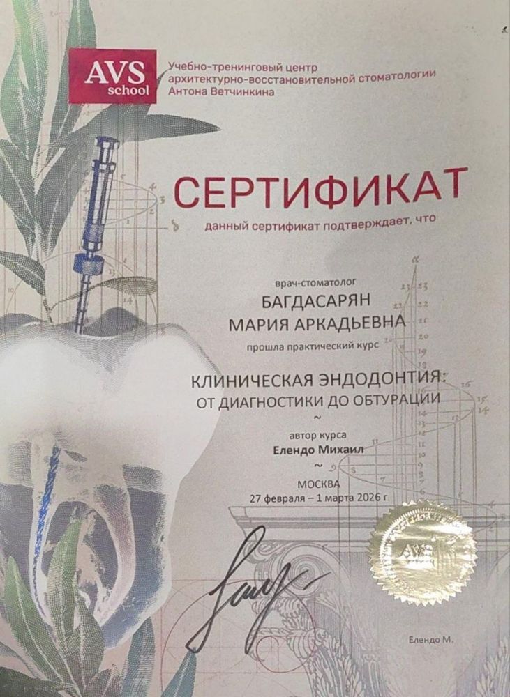 2017г. — Сертификат участника практического курса(3ч) «Современная эндодонтия: просто и эффективно»;