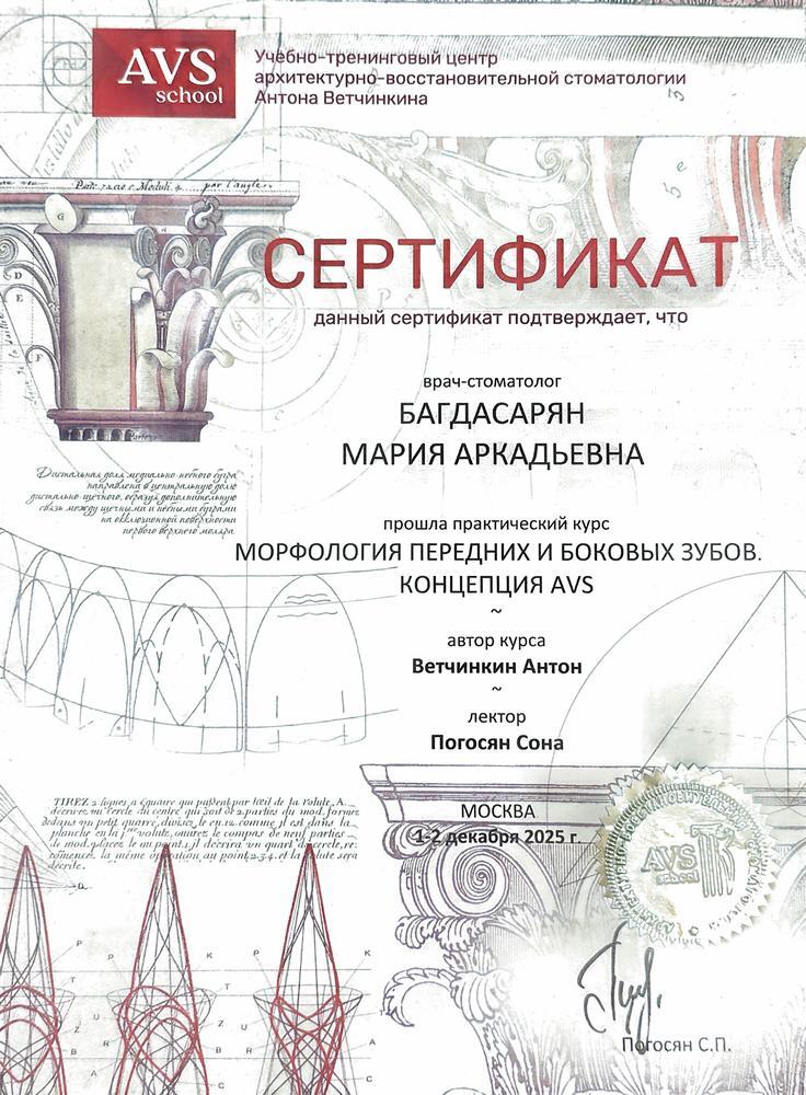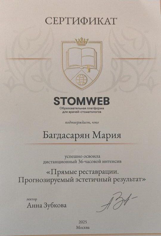 2018г. — Сертификат об участии на курсе «Прямые композитные реставрации. Простые рецепты на каждый день. Концепция Style Italiano»;