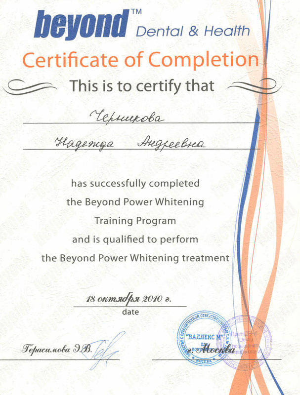 2010 г. — «Отбеливание зубов системой Beyond», НОУ Центр повышения квалификации «ПрезиДЕНТ», ООО «Валлекс М», г. Москва