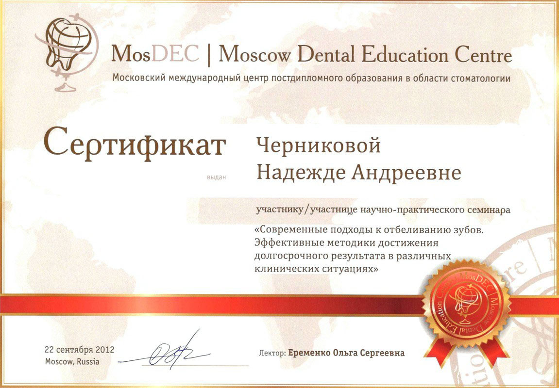 2012 г. — «Современные подходы к отбеливанию зубов. Эффективные методики достижения долгосрочного результата в различных клинических ситуациях» «Mos Dec» г. Москва