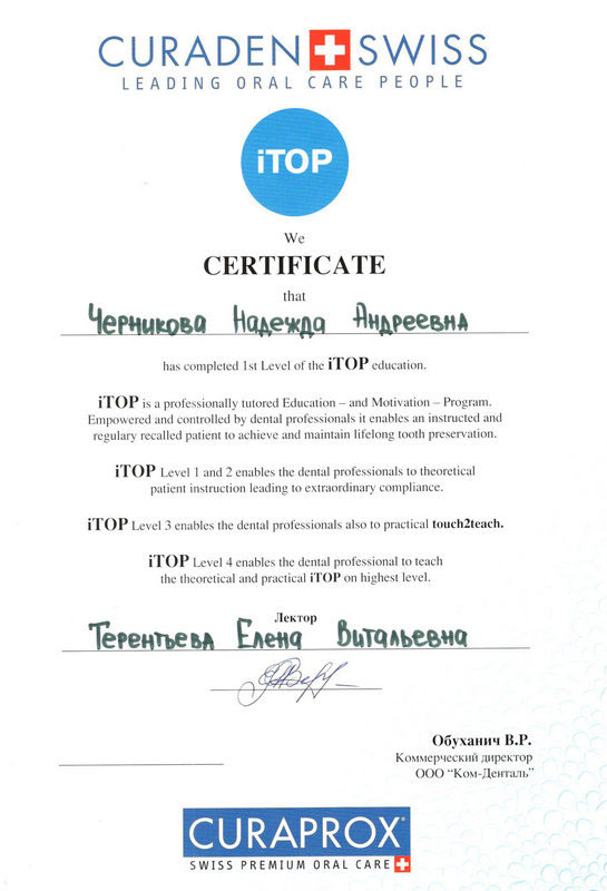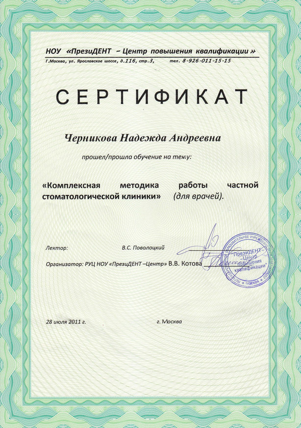 2011 г. — «Комплексная методика работы частной стоматологической клиники», НОУ Центр повышения квалификации «ПрезиДЕНТ», г. Москва