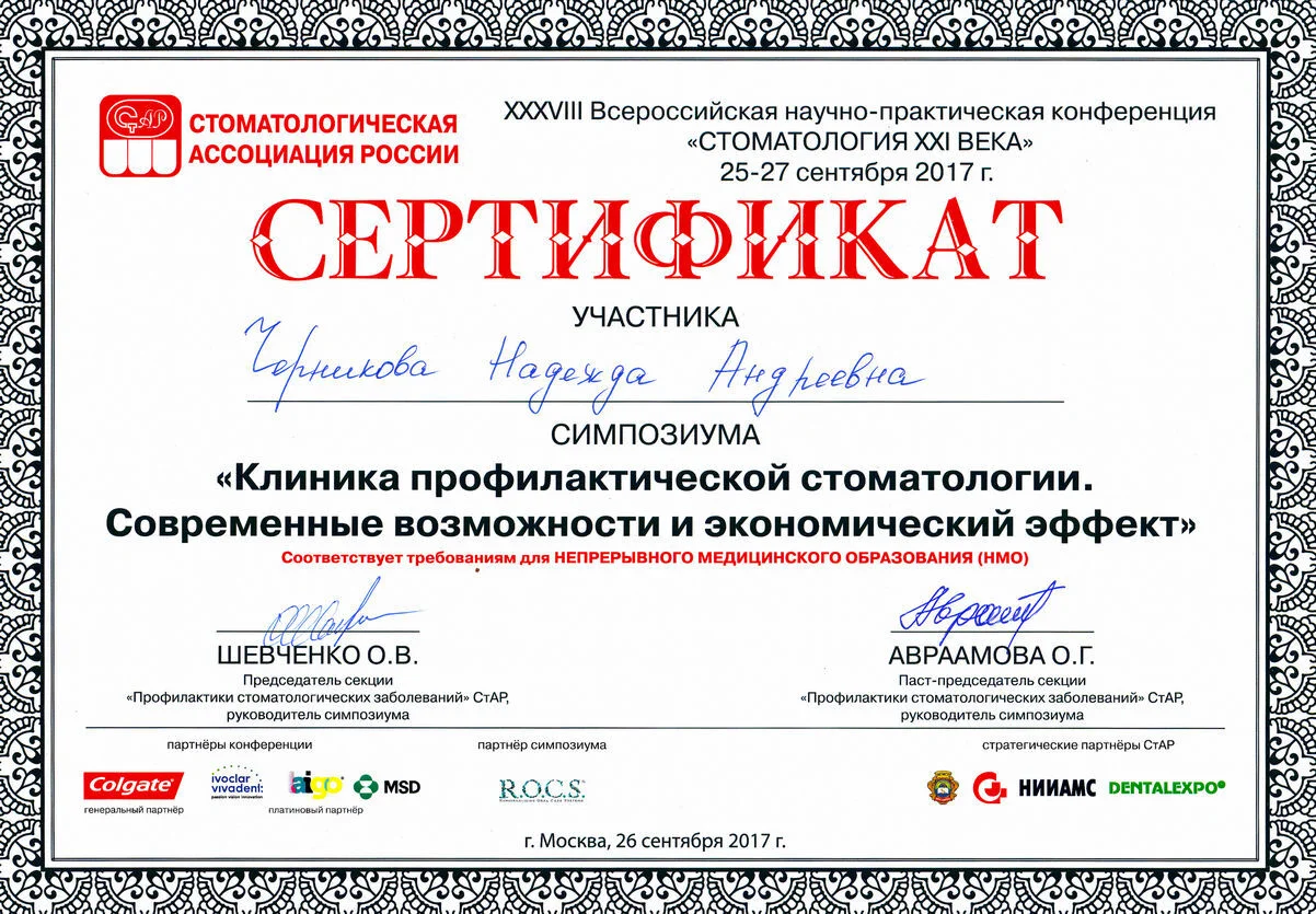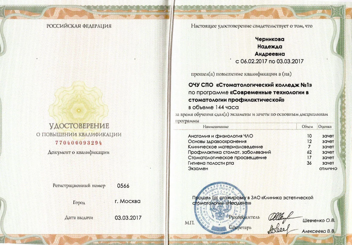2017г. – Удостоверение о повышении квалификации сертификат специалиста «Стоматология профилактическая», Курс повышения квалификации по программе «Современные технологии в стоматологии профилактической», ОЧУ СПО «Стоматологический колледж №1»