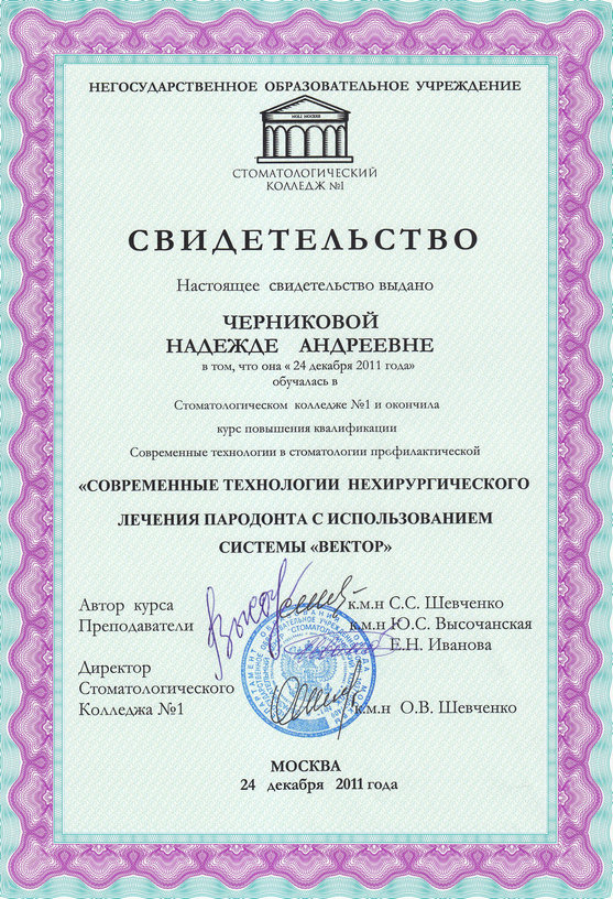2011 г. — «Современные технологии нехирургического лечения пародонта с использованием системы «Vector» Стоматологический колледж № 1, г. Москва