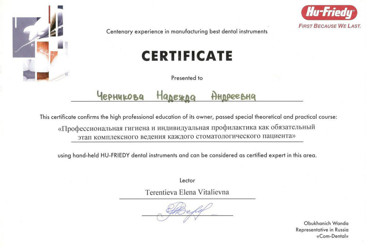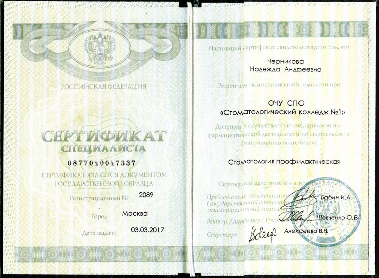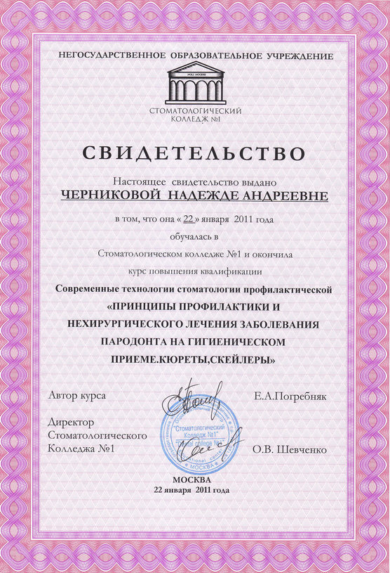 2009г. – Удостоверение о повышении квалификации и сертификат специалиста «Стоматология профилактическая» выдан НОУ-ОЦ «Стоматологический колледж №1» г. Москва. Сертификат действителен 5 лет