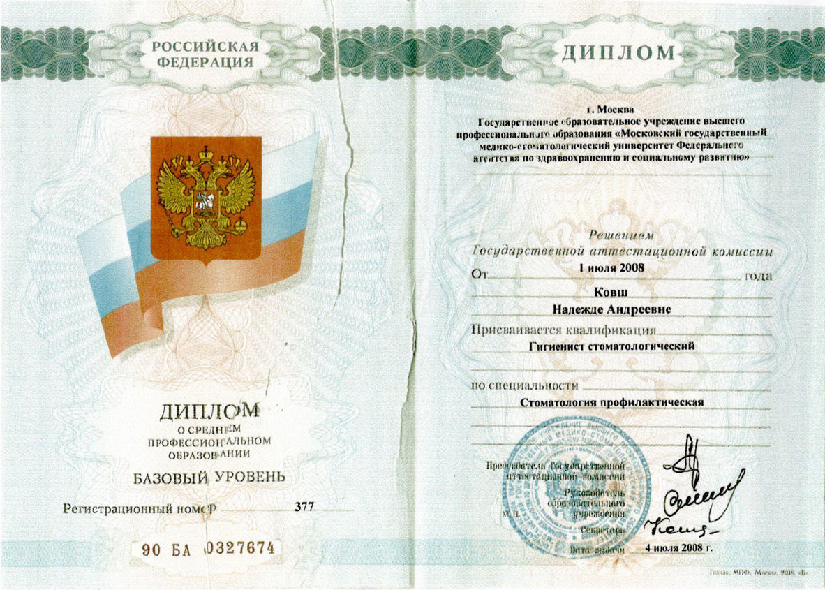 2008г. – Окончила ГОУ ВПО «Московский государственный медико-стоматологический университет Федерального агентства по здравоохранению и социальному развитию», г. Москва присвоена квалификация «Гигиенист стоматологический»