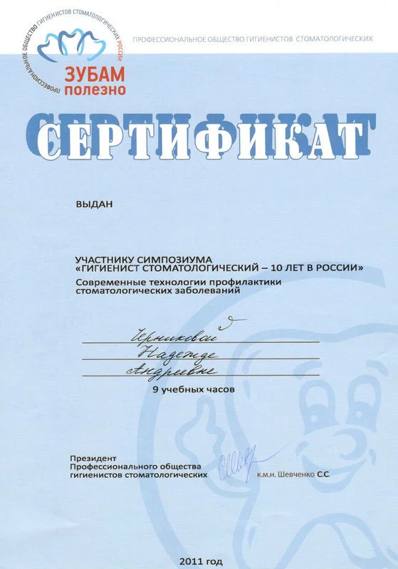 2011 г. — «Симпозиум «Гигиенист стоматологический — 10 лет в России». Современные технологии профилактики стоматологических заболеваний, г. Москва