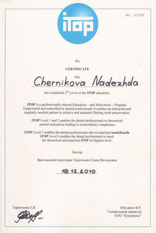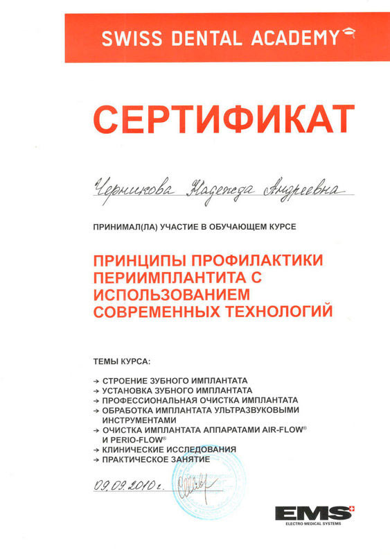 2010 г. — «Принципы профилактики периимплантита и заболеваний пародонта с использованием современных технологий» Swiss Dental Academy, г. Москва
