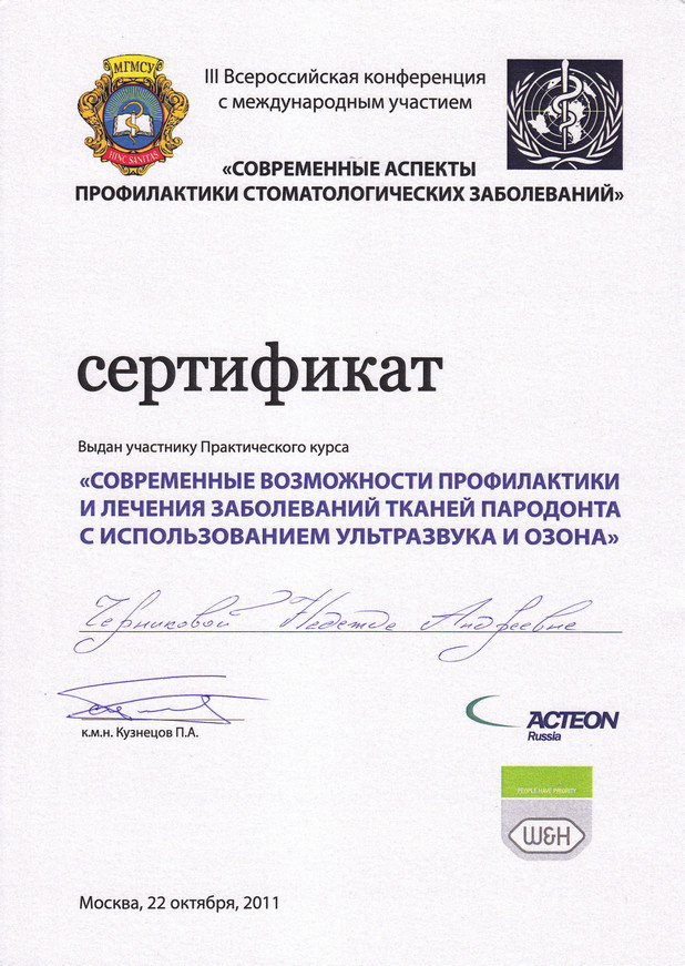 2011 г. — «Современные возможности профилактики и лечения заболеваний тканей пародонта с использованием ультразвука и озона», Acteon Russia, г. Москва