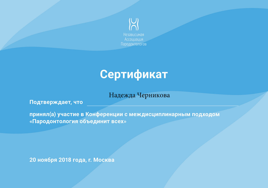 2018 г. — приняла участие в Конференции с междисциплинарным подходом «Пародонтология объединит всех»