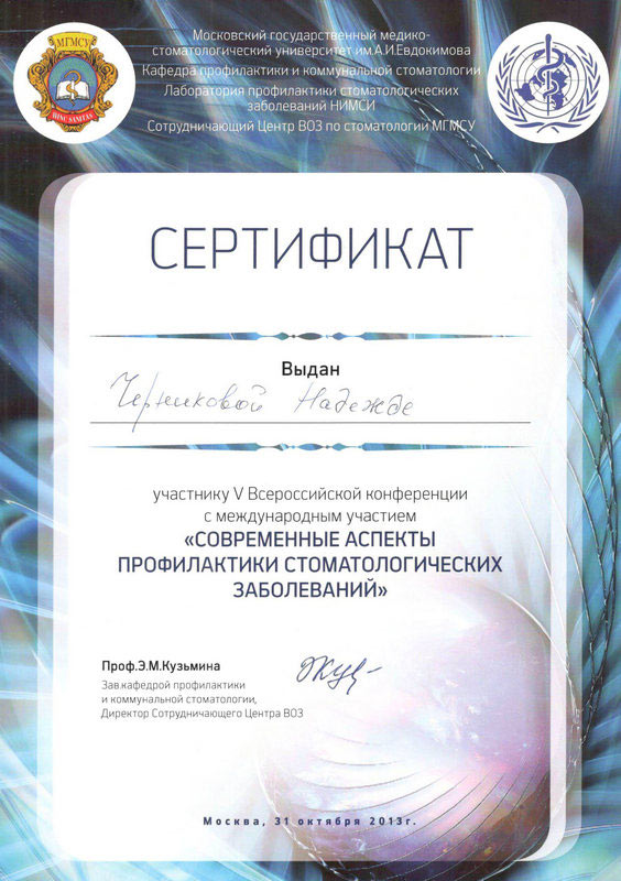 2013 г. — Приняла участие в V Всероссийской конференции с международным участием «Современные аспекты профилактики стоматологических заболеваний», г. Москва