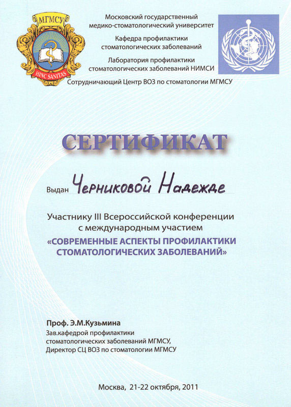 2011 г. — «III Всероссийская конференция с международным участием «Современные аспекты профилактики стоматологических заболеваний», г. Москва