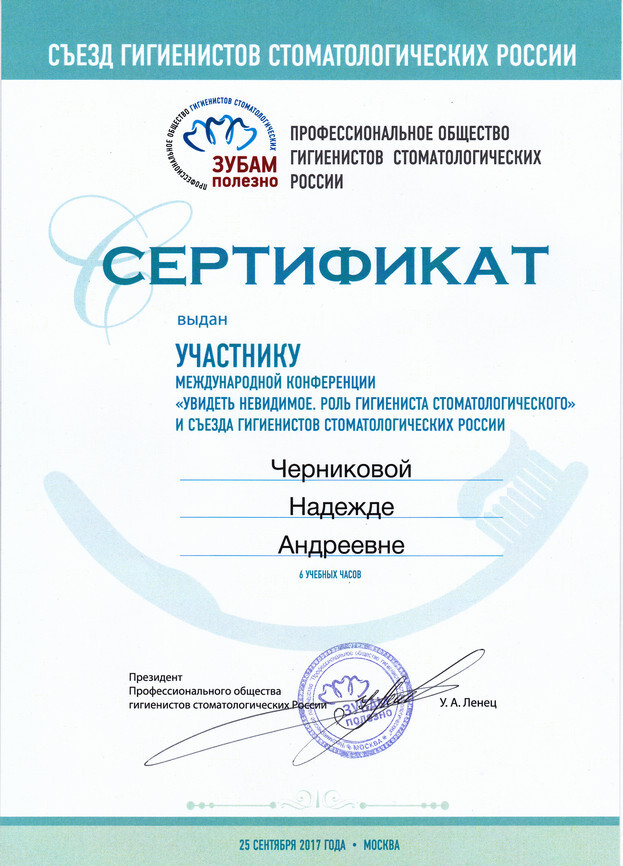 2017 г. — Приняла участие в международной конференции «Увидеть невидимое. Роль гигиениста стоматологического», г. Москва