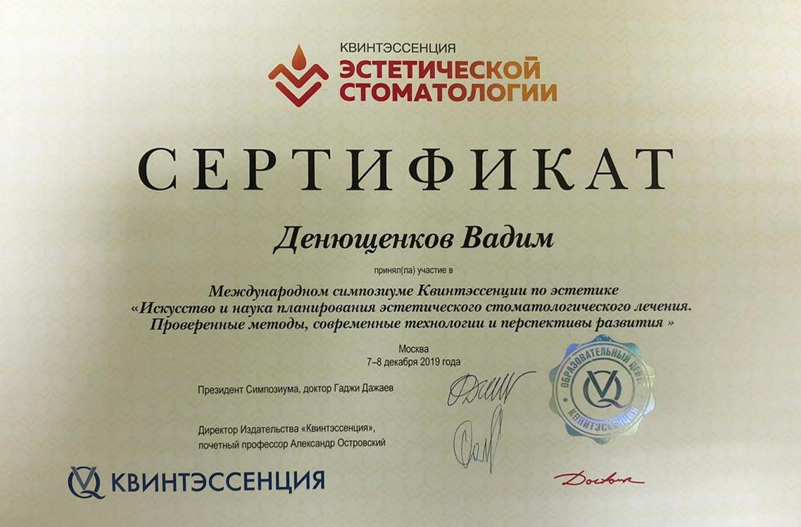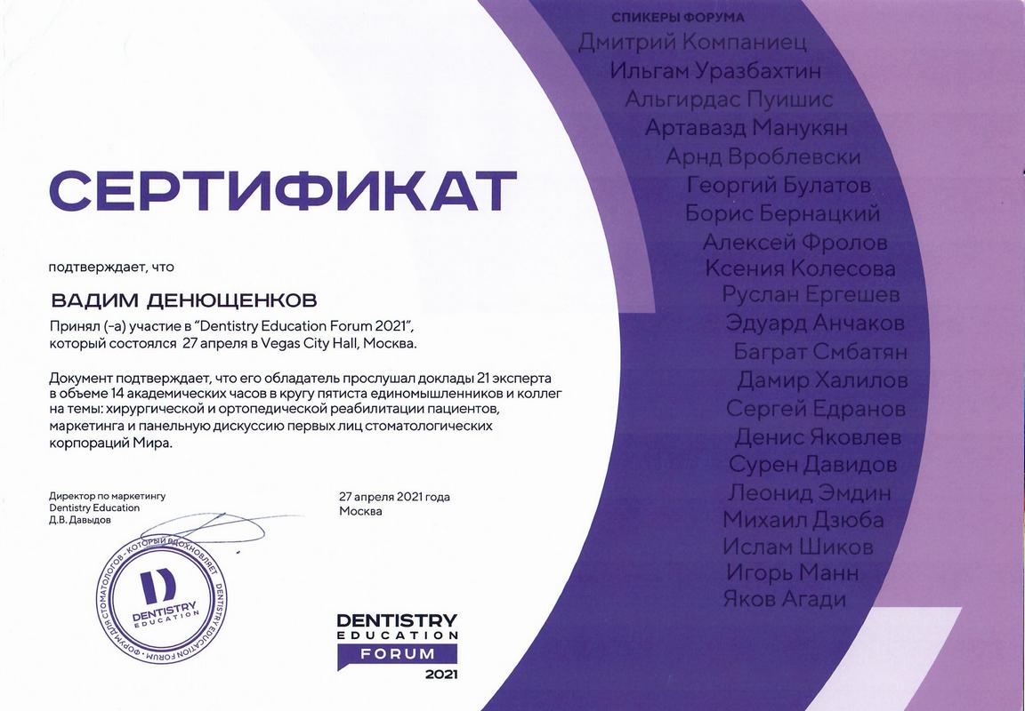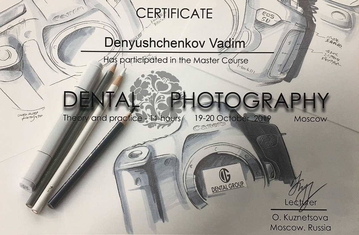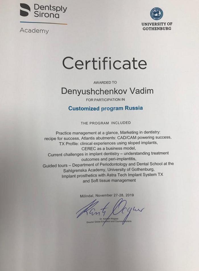 Сертификат по «Стоматологии общей практики» ГОУ ВПО «Смоленская Государственная Медицинская Академия Федерального агентства по здравоохранению и социальному развитию». г.Смоленск.