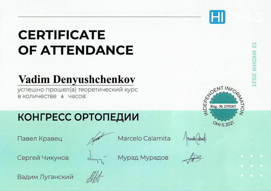 Сертификат специалиста по специальности «Стоматология ортопедическая» на базе Российского Университета Дружбы Народов (РУДН) г.Москва.