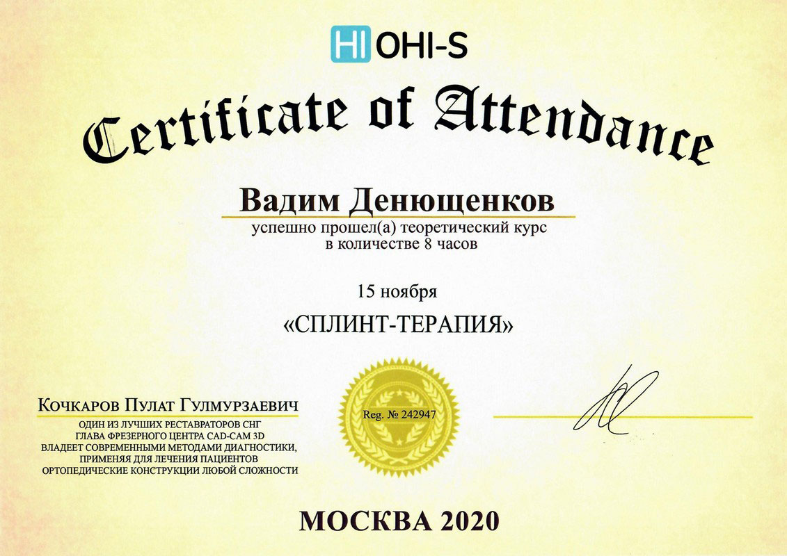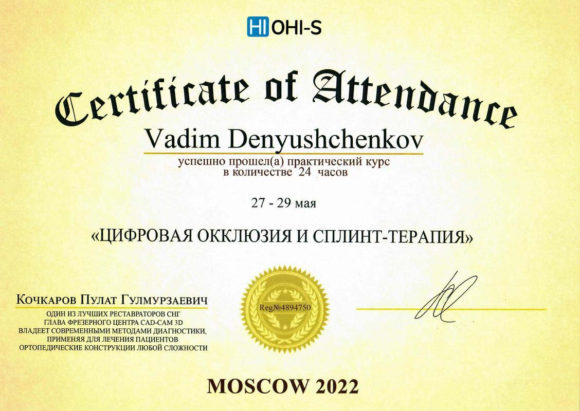 Сертификат «Техники компьютерного анализа окклюзии аппаратом T-Scan III. Авторский курс Р. Керстена»