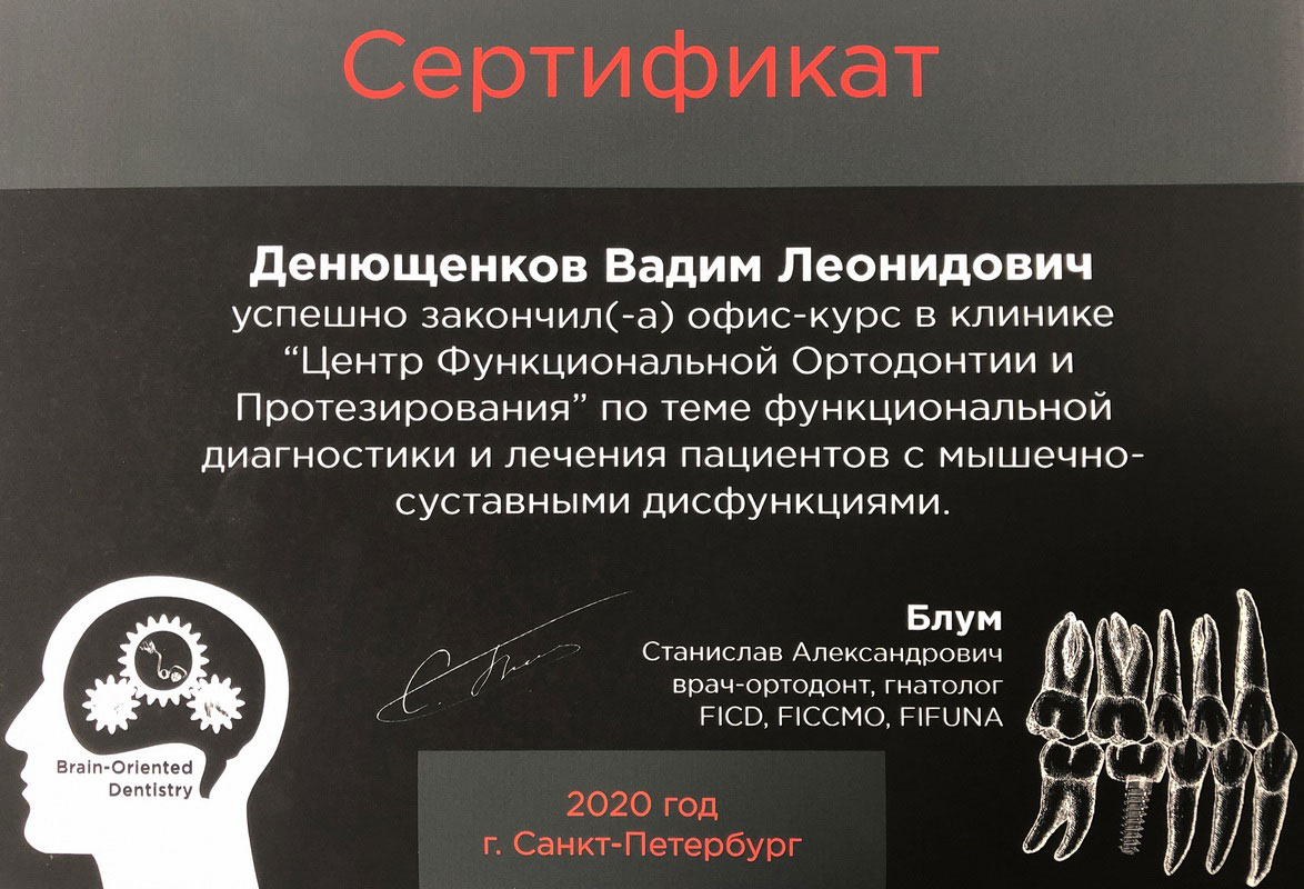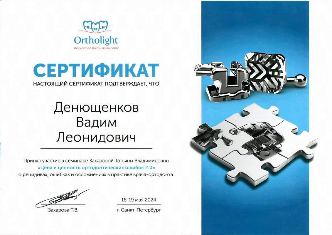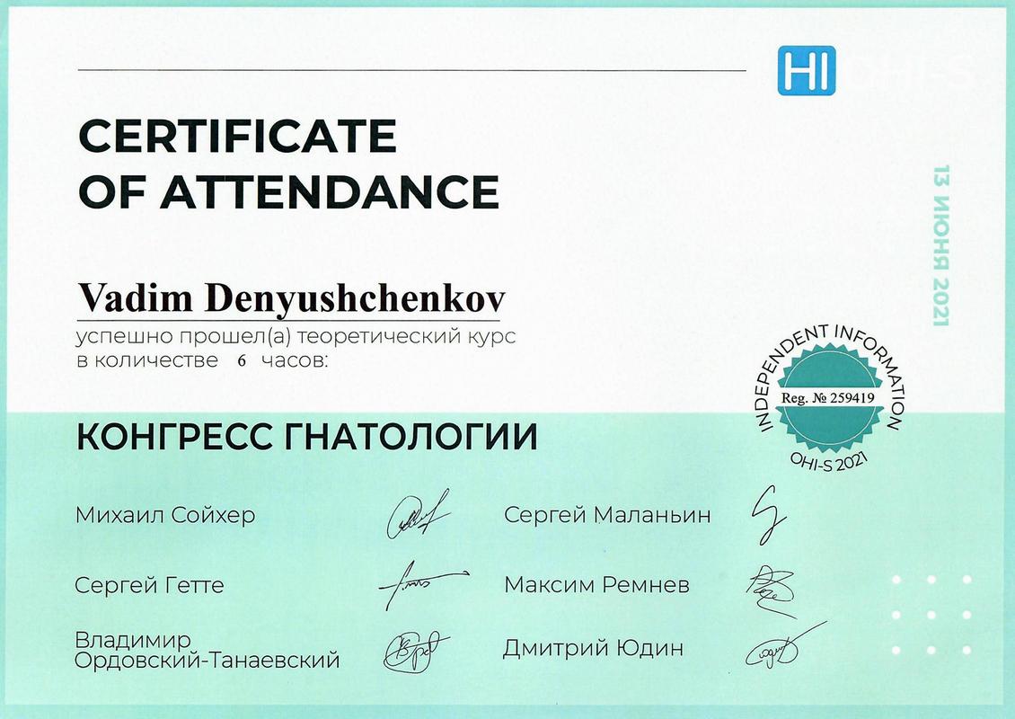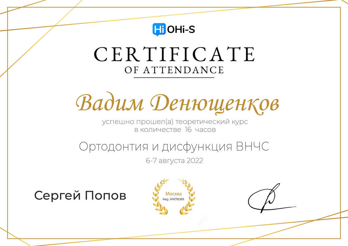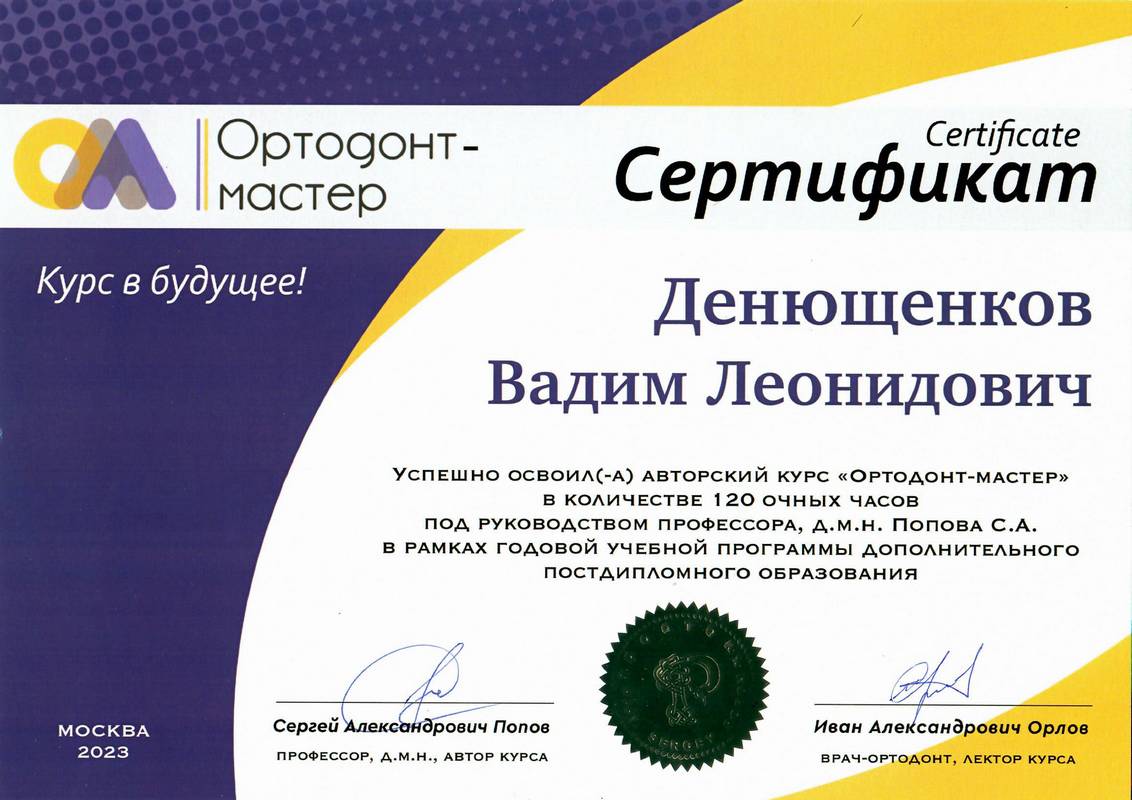 Сертификат специалиста по специальности «Ортодонтия» ГОУ ВПО «Смоленская Государственная Медицинская Академия Федерального агентства по здравоохранению и социальному развитию». г.Смоленск.