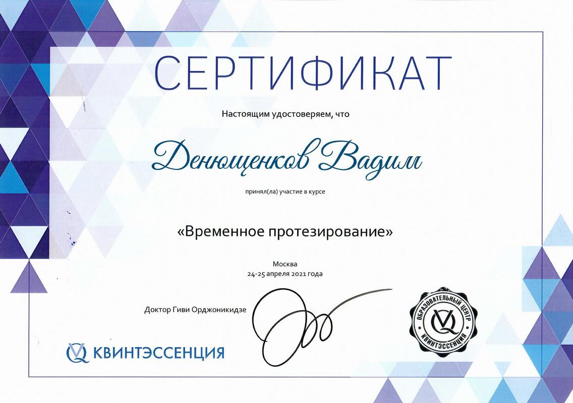 Сертификат специалиста по специальности «Стоматология ортопедическая», Автономная некоммерческая организация дополнительного профессионального образования «Академия инновационной стоматологии» г.Москва.