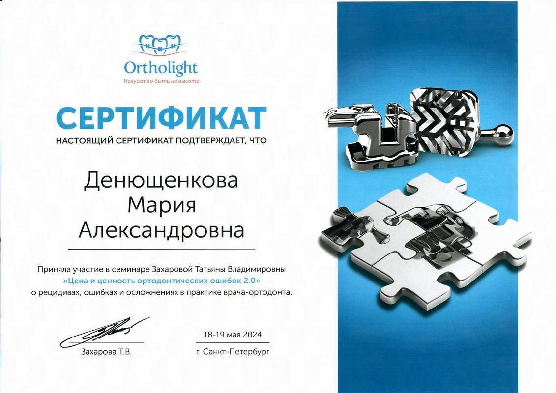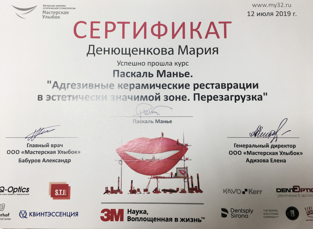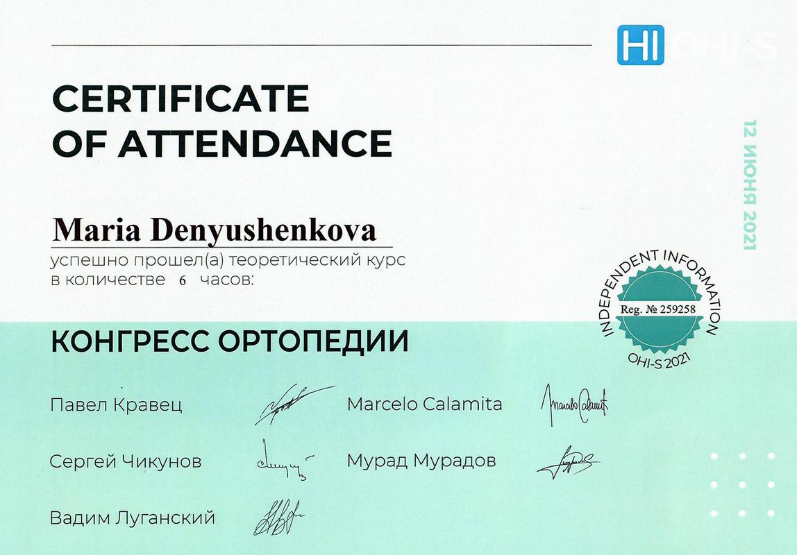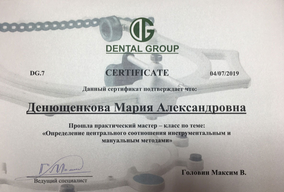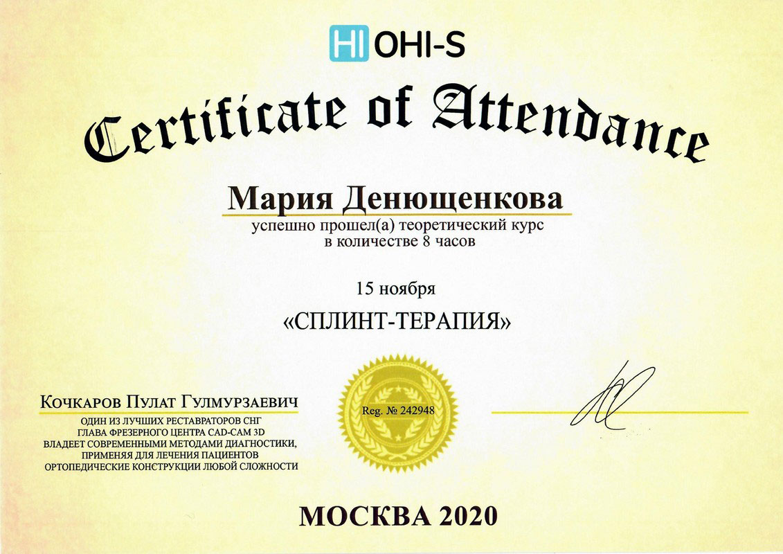 Сертификат по специальности «Стоматология общей практики», ГОУ ВПО «Смоленская Государственная Медицинская Академия», г.Смоленск.