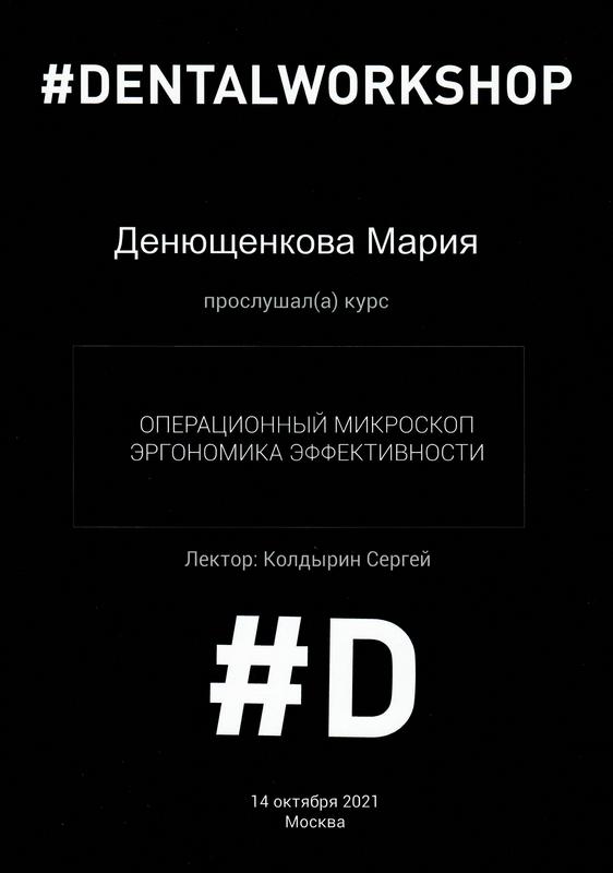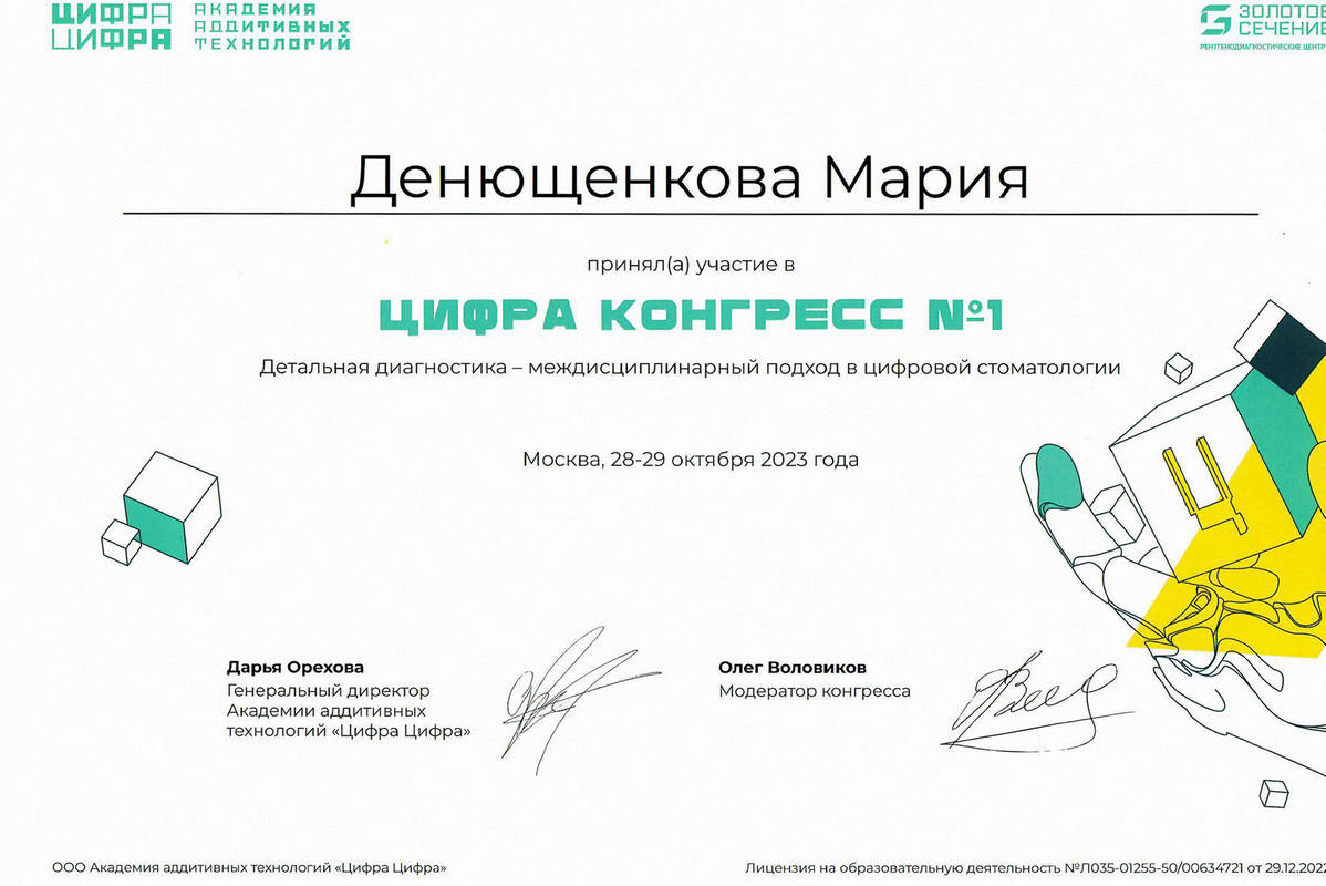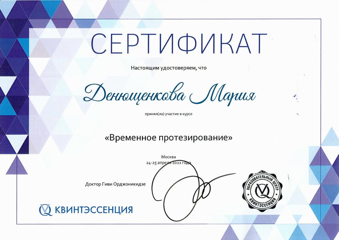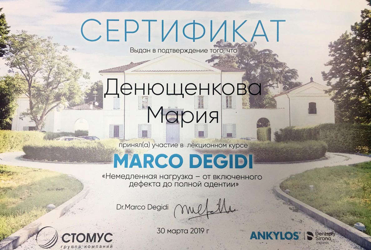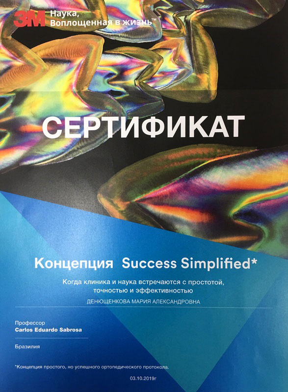 Сертификат по специальности «Стоматология общей практики», ГОУ ВПО «Смоленская Государственная Медицинская Академия», г.Смоленск.