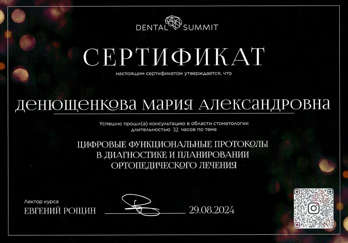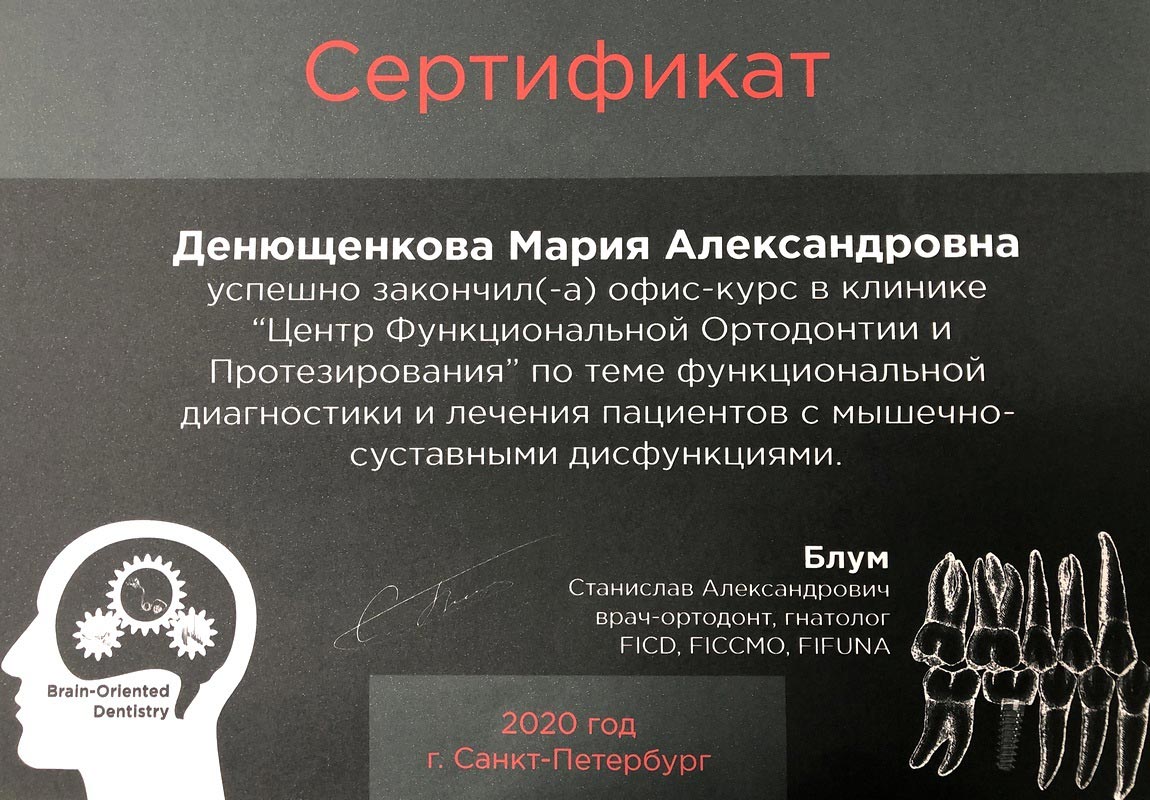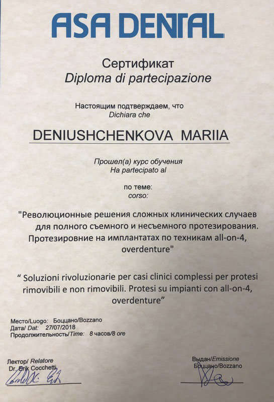Сертификат специалиста по специальности «Стоматология ортопедическая» АНО ДПО АИСт, г.Москва.