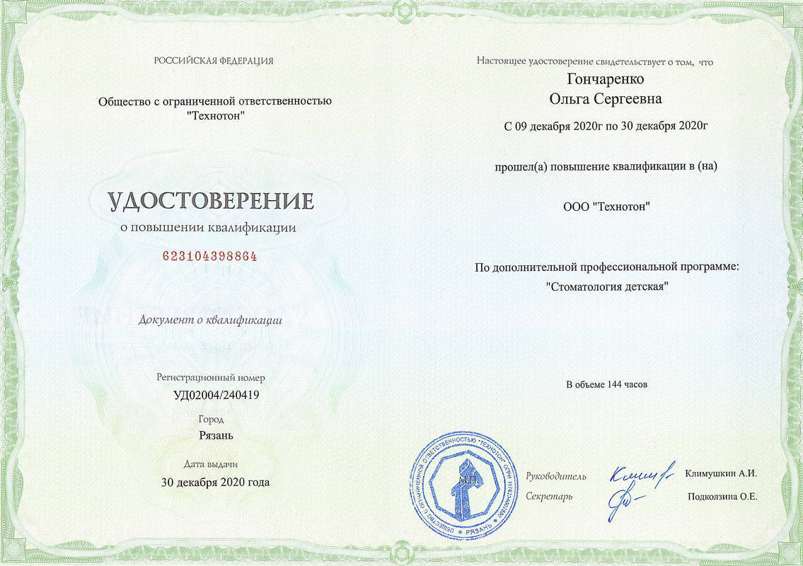 - 2020г. — Удостоверение о повышении квалификации Стоматология Детская ООО «Технотон» г.Рязань.
