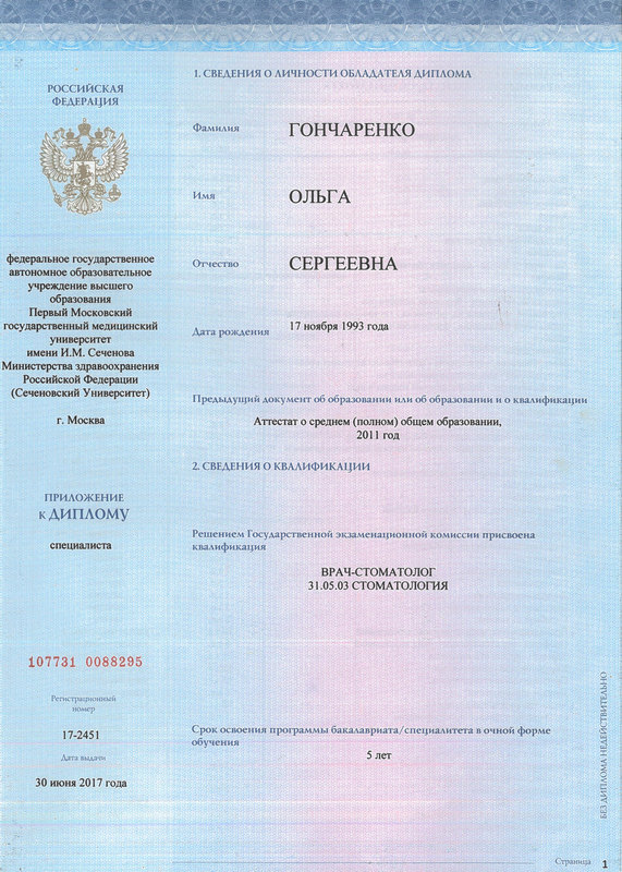 - 2017г. — Диплом по специальности Врач-стоматолог ПМГМУ им. И.М. Сеченова г.Москва.