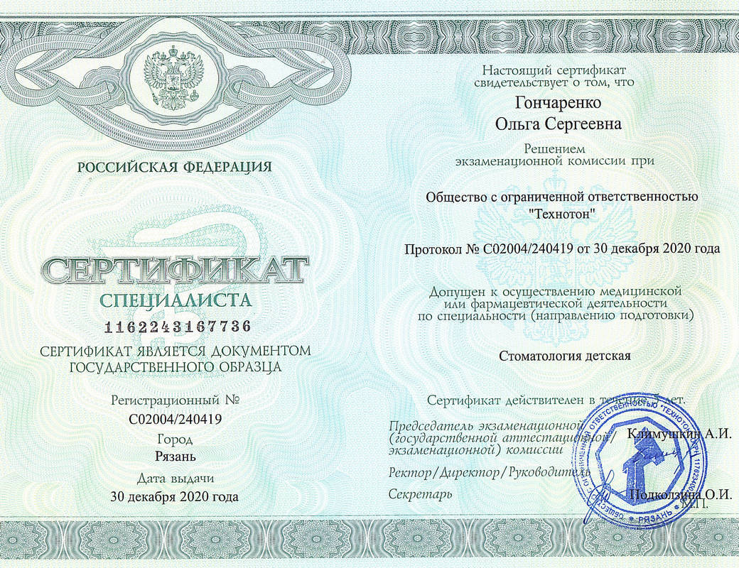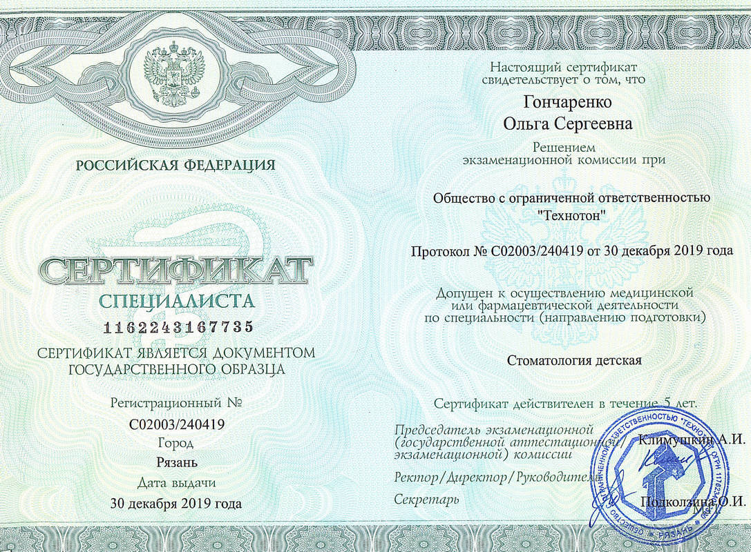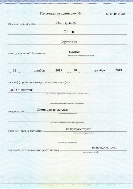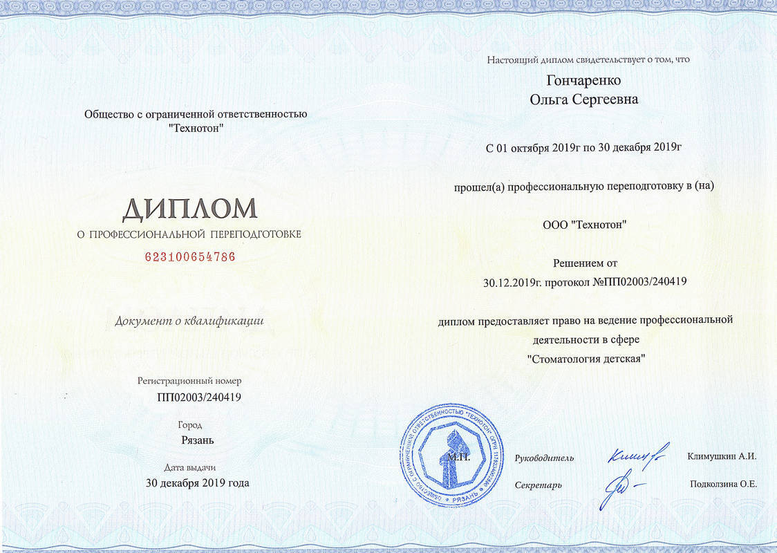 - 2019г. — Диплом о профессиональной переподготовке Стоматология детская ООО «Технотон».