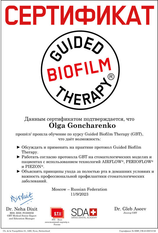 - 2023г. — GBT протокол профессиональной гигиены на аппарате Prophylaxis.