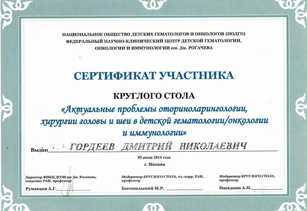 2014г. — Участник круглого стола «Актуальные проблемы оториноларингологии, хирургии головы и шеи в детской гематологии/онкологии и иммунологии»