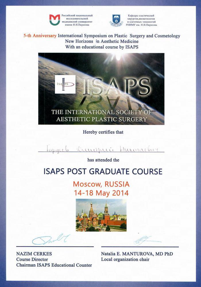 2014г. — 5-th Anniversary International Symposium on Plastic Surgery and Cosmetology, New Horizons in Aesthetic Medicine With an educational course by ISAPS.