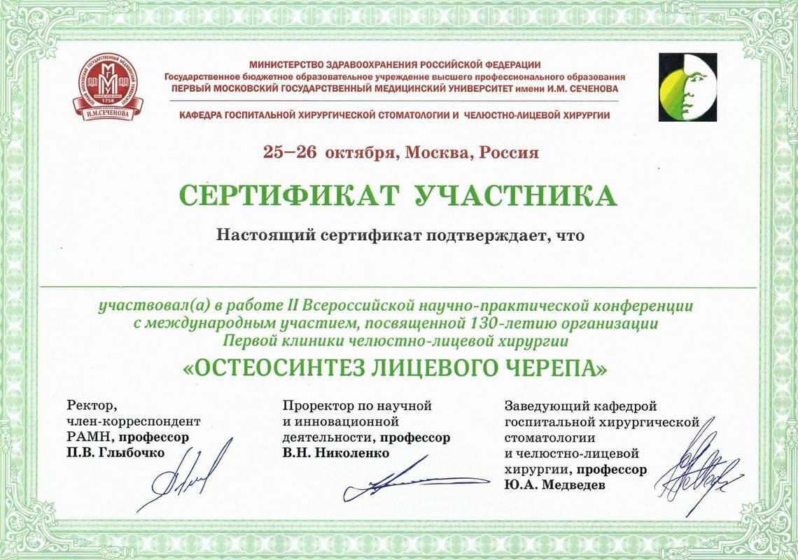 2012г. — Участвовал в работе II Всероссийской научно-практической конференции с международным участием, посвящённой 130-летию организации Первой клиники челюстно-лицевой хирургии «ОСТЕОСИНТЕЗ ЛИЦЕВОГО ЧЕРЕПА»