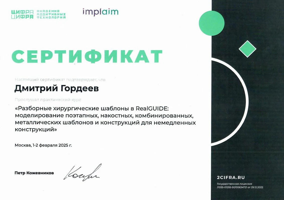 2025г. — Прошёл практический курс: «Разборные хирургические шаблоны в RealGuide: моделирование поэтапных, накостных, комбинированных, металлических шаблонов для немедленных конструкций». Пётр Кожевников.