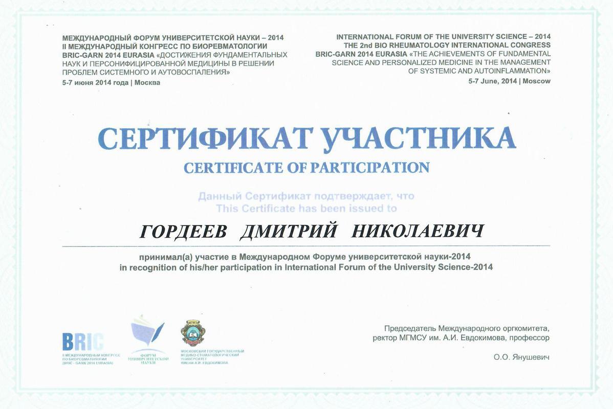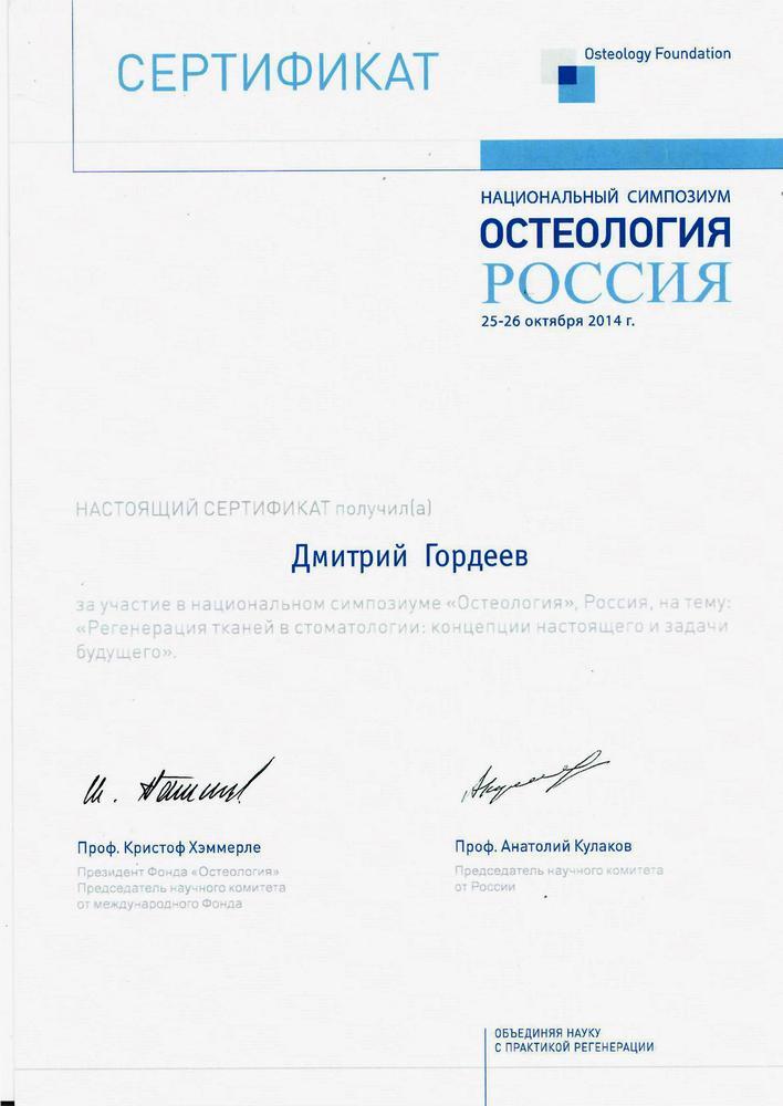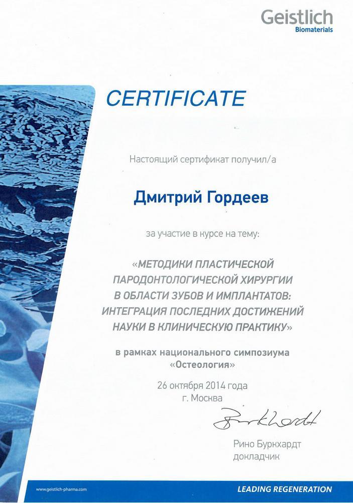 2014г. — Участие в курсе «МЕТОДИКИ ПЛАСТИЧЕСКОЙ ПАРОДОНТОЛОГИЧЕСКОЙ ХИРУРГИИ В ОБЛАСТИ ЗУБОВ И ИМПЛАНТАТОВ: ИНТЕГРАЦИЯ ПОСЛЕДНИХ ДОСТИЖЕНИЙ НАУКИ В КЛИНИЧЕСКУЮ ПРАКТИКУ». В рамках национального симпозиума «Остеология». Geistlich.