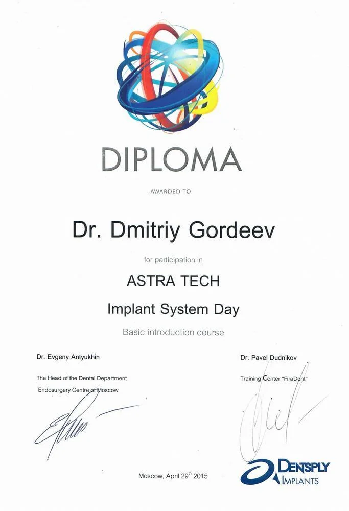 2015г. — DIPLOMA for participation in ASTRA TECH implant System Day. Basic introduction course.