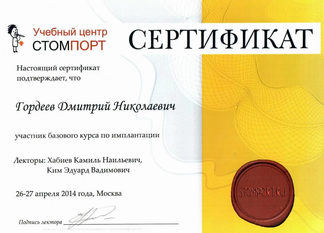 2015г. — окончил дополнительную профессиональную образовательную программу в ГБУЗ МО МОНИКИ им. М. Ф. Владимирского по программе повышения квалификации: «Дентальная имплантация»
