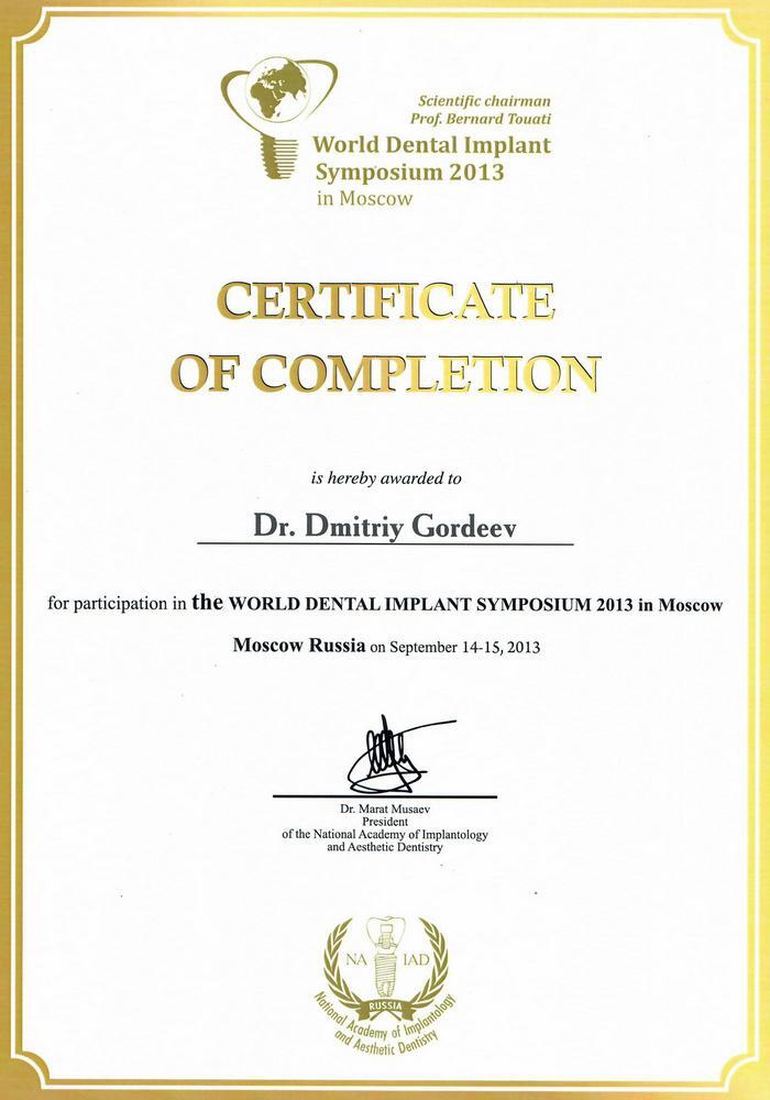 2013г. — CERTIFICATE OF COMPLETION. THE WORLD DENTAL IMPLANT SYMPOSIUM IN Moscow.